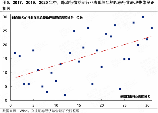 从行业表现来看,牛市躁动行情中的领涨行业也没有发生明显的切换:2017、2019和2020年,躁动行情期间的行业表现与年初以来的行业表现整体呈正相关。
